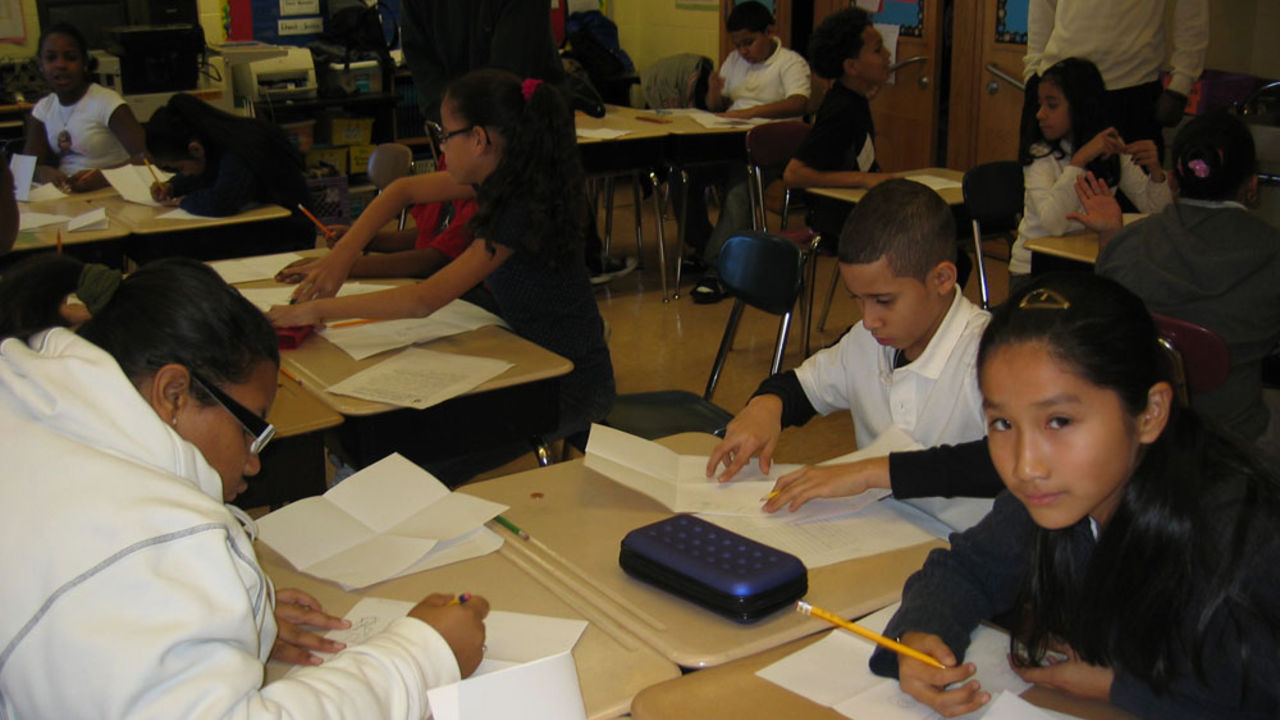 Groundswell and the New York City Department of Transportation (NYC DOT) designed the Traffic Safety Sign Residency Program to engage public school students in exploring traffic safety information through the creation of original street signs. Signs designed collaboratively by students at each of our partner schools are digitally rendered by Groundswell artists, fabricated by NYC DOTs Sign Shop, and temporarily installed in local locations students identify as in need of traffic signage. Through this program, students learn how signs and symbols can work to communicate ideas and explore visual art techniques to develop graphic images. These signs then help increase safety awareness and prevent accidents in locations around each school community. Students from PS 4 chose to represent a student in a wheelchair next to someone with headphones, to illustrate the need for care of all kinds of differently abled individuals.